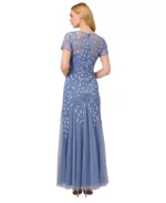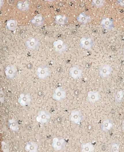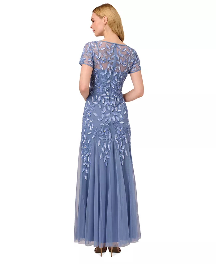- Illusion neckline; embellished floral beading; mesh godets