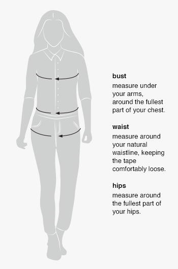 | Size | Bust (in.) | Waist (in.) | Hip (in.) |